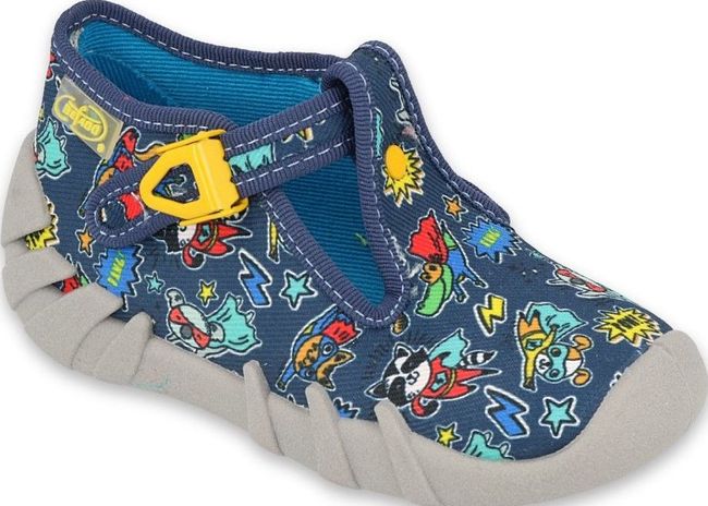 Dětská obuv vel.22 baleno po vel. DÝCHAJÍCÍ PODRÁŽKA, Boty mají boky stabilizující chodidlo, ohýbání podešve v souladu s doporučením ortopedů, vyztužený zadní pásek, širší špičky a prodyšnou podešev. Doporučují se jako obuv pro doma, ale během suchých, teplých dnů je lze použít i venku. Vyrobeno z bavlněných tkanin.